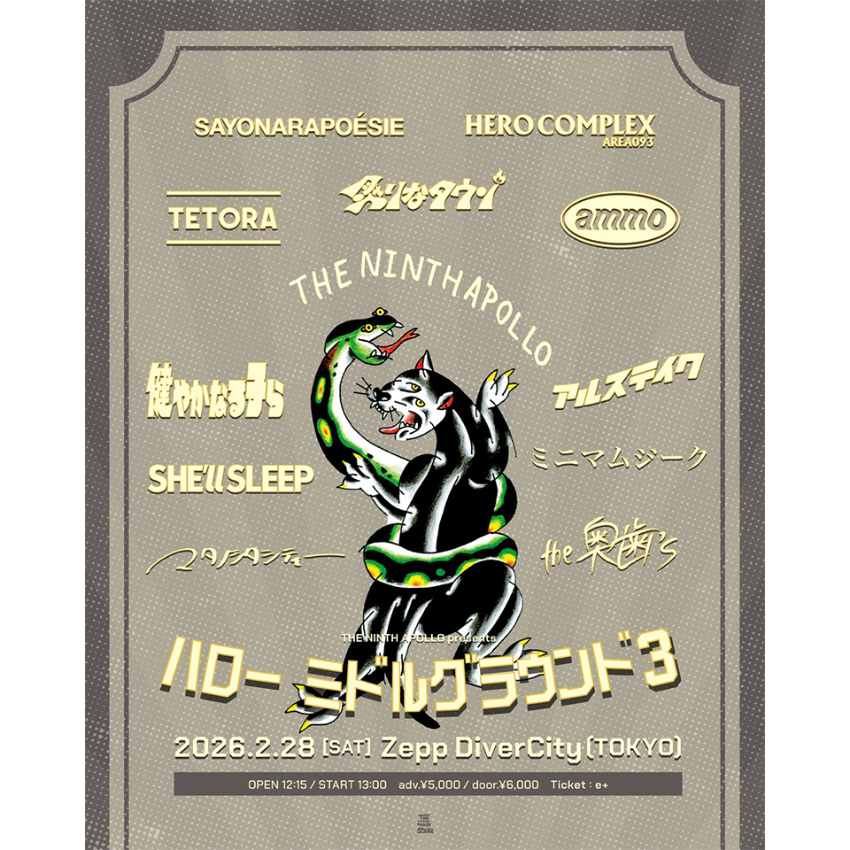 来年2月28日(土)、Zepp DiverCity(TOKYO)にて、大阪の音楽レーベルTHE NINTH APOLLO主催イベント「THE NINTH APOLLO pre ハローミドルグラウンド3」の開催が決定!