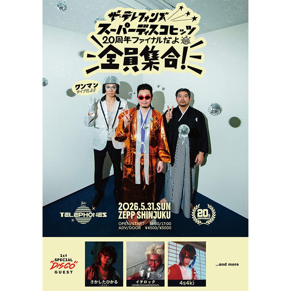 本日the telephonesが、Zepp Shinjuku(TOKYO)にて結成20周年記念イベント『SUPER DISCO HITS!!! –20周年ファイナルだよ、全員集合–』を開催することを発表しました!スペシャルゲストとして、4s4ki・イチロック(SPARK!!SOUND!!SHOW!!)・さかしたひかる(ドミコ)の出演も同時発表されました!