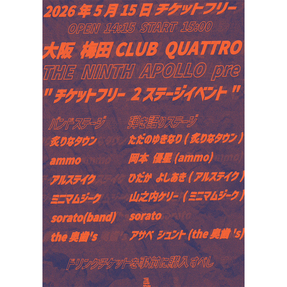 来月5月15日(金)、梅田CLUB QUATTROにて大阪の音楽レーベルTHE NINTH APOLLO主催イベント「THE NINTH APOLLO pre "チケットフリー 2ステージイベント"」の開催が決定!本公演は入場無料となりますが、ご入場にはイープラスにてドリンクチケットの事前購入が必要となります。